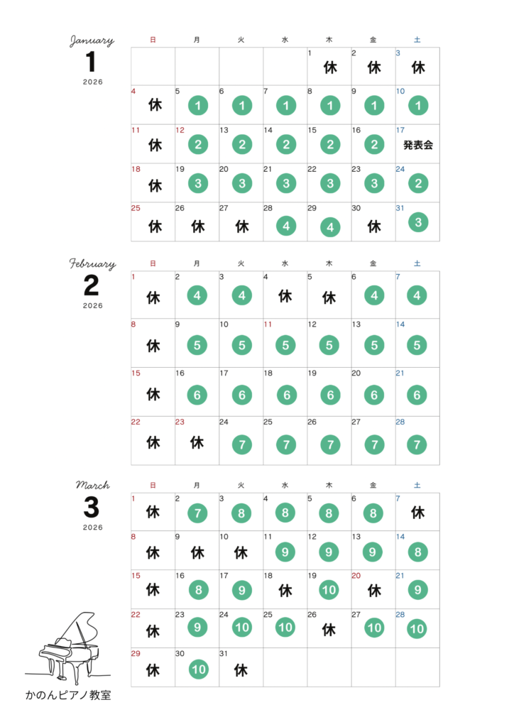 先日、2026年1月〜3月のレッスンスケジュールを配布しました。