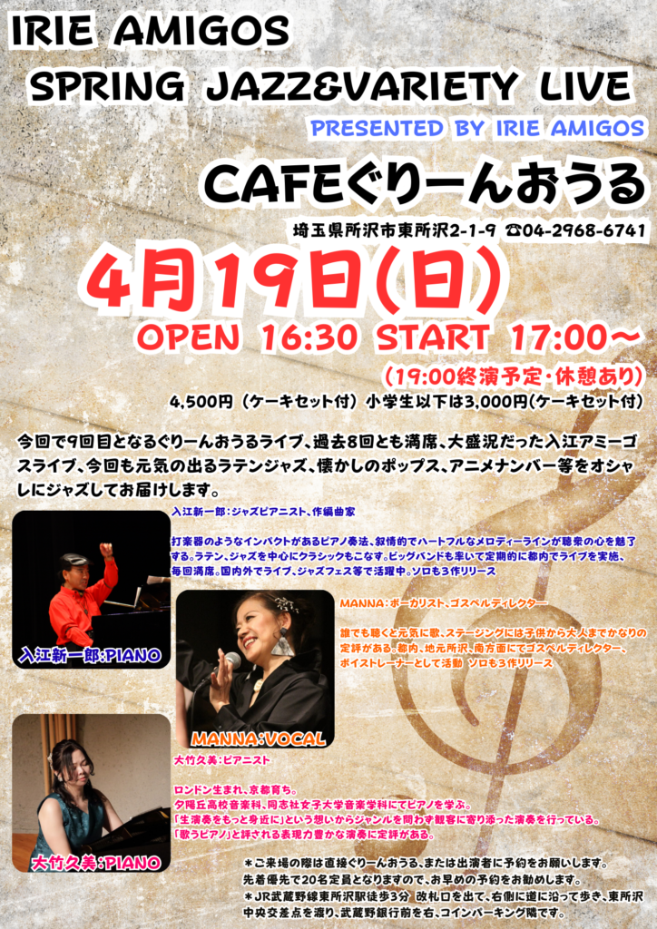 本番は4月19日、東所沢のCAFEぐりーんおうるにて、ジャズシンガーMANNAさんと3人でのライブです。